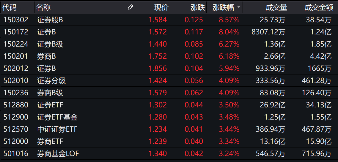 除此之外,券商股尾盘异动拉升,国盛金控(002670.SZ)涨停,中信建投(601066.SH)、中信证券(600030.SH)一度涨停,申万非银金融板块涨幅为2.31%。场内券商主题基金同样大涨,证券股B(150302.SZ)、证券B(150172.SZ)涨幅超过8%,证券B级(150224.SZ)、券商B(150201.SZ)涨幅超过6%。