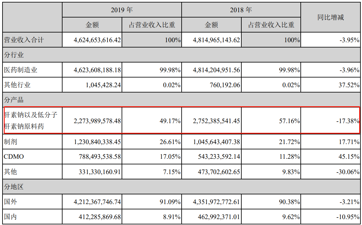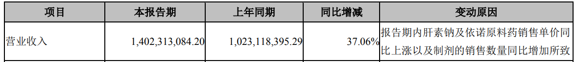 财报显示,2019年,海普瑞肝素钠以及低分子肝素钠原料药占营业收入的比重为49%。今年一季度海普瑞营收同比增长37.06%,对于业绩变动原因,公司表示,报告期内肝素钠及依诺原料药销售单价同比上涨以及制剂的销售数量同比增加所致。