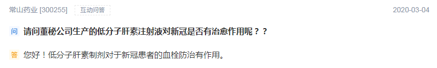 常山药业今年3月也在回复投资者提问时表示,低分子量肝素皮下注射可以用于新型肺炎患者的血栓预防和治疗。