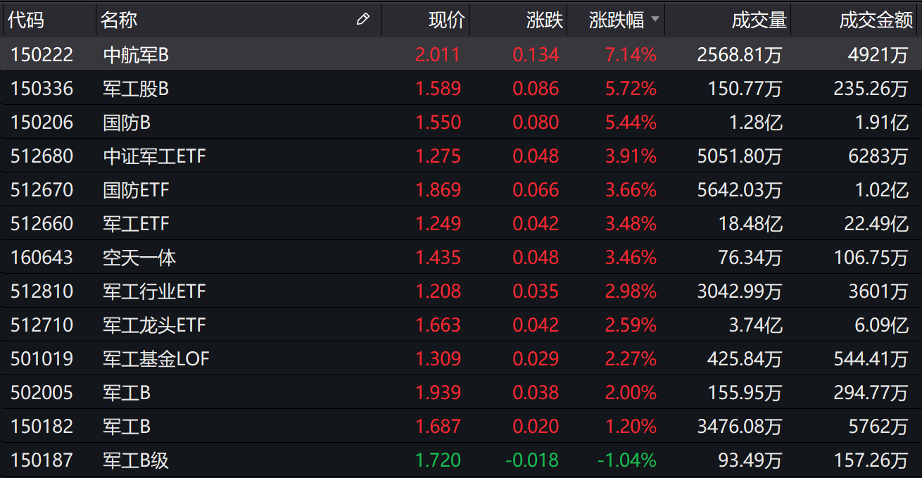 军工板块可以称得上是本周最强势的板块。今日开盘后军工板块一度出现回调迹象,但临近午盘再度强势上攻,申万国防军工板块以2.58%的涨幅再度位居申万一级行业涨幅榜第一名。场内绝大多数军工主题基金收涨,其中,中航军B(150222.SZ)涨幅超过7%,军工股B(150336.SZ)、国防B(150206.SZ)涨幅超过5%。