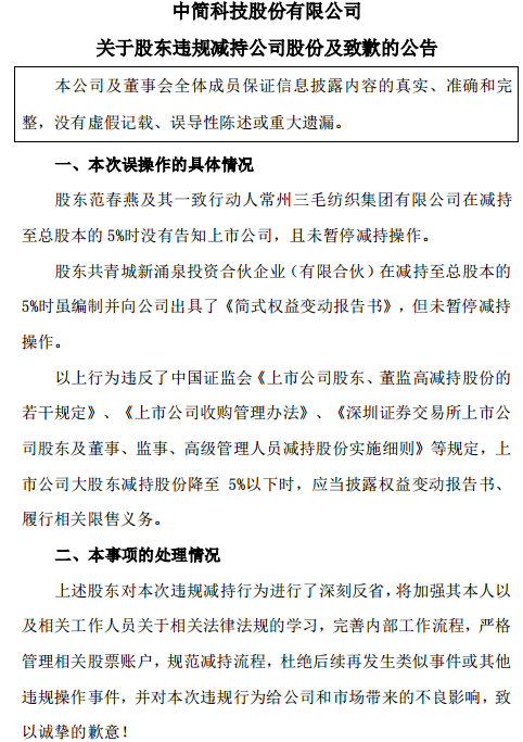 中简科技表示,上述股东对本次违规减持行为进行了深刻反省,将加强其本人以及相关工作人员关于相关法律法规的学习,完善内部工作流程,严格管理相关股票账户,规范减持流程,杜绝后续再发生类似事件或其他违规操作事件,并对本次违规行为给公司和市场带来的不良影响,致以诚挚的歉意。
