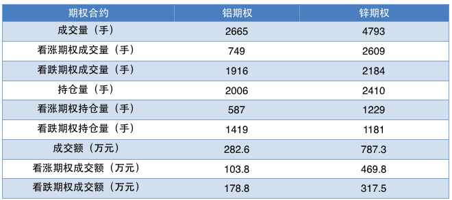 上市首日,铝期权成交2665手,持仓2006手,成交额为282.66万元;锌期权成交4793手,持仓2410手,成交额为787.3万元。
