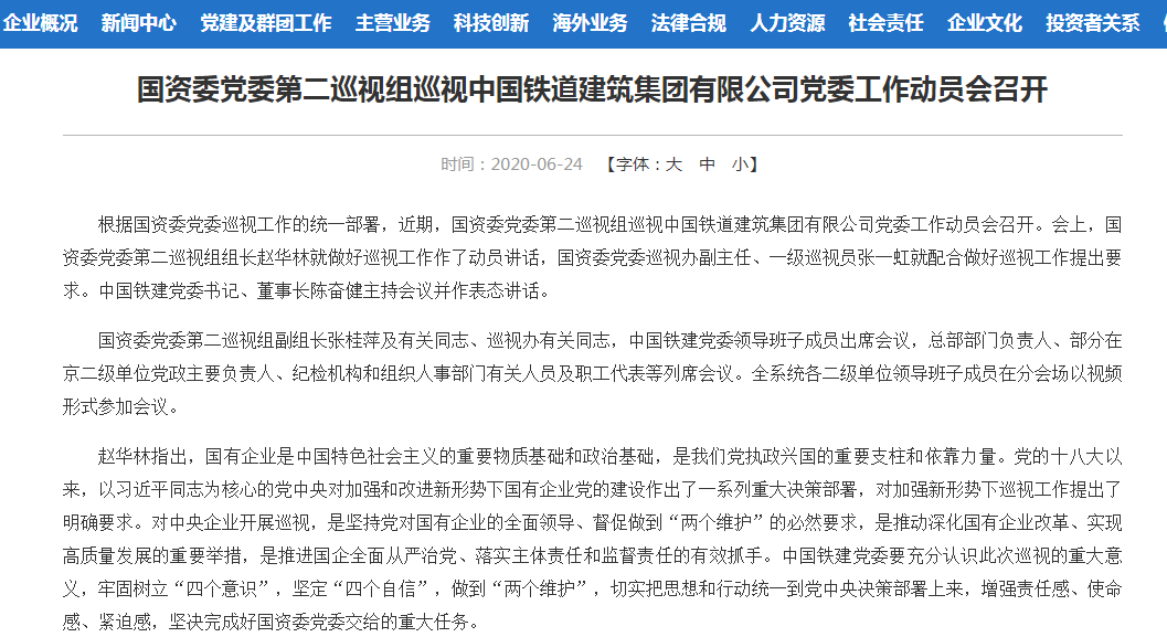 据中国铁建官网6月24日发布的消息,国资委党委第二巡视组将在中国铁道建筑集团有限公司工作2个月左右。巡视组受理信访时间截止到2020年8月15日。