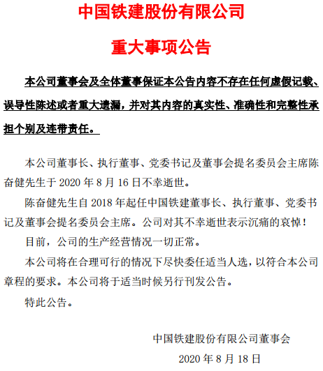 8月18日早间,中国铁建发布重大事项公告,公告称公司董事长、执行董事、党委书记及董事会提名委员会主席陈奋健于2020年8月16日不幸逝世。目前,公司生产经营情况一切正常。