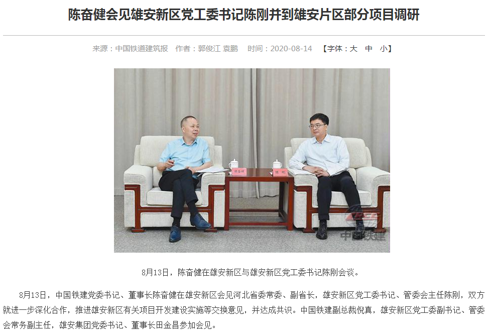 此外,官网显示,陈奋健最近一次公开活动是8月13日在雄安新区会见河北省委常委、副省长,雄安新区党工委书记、管委会主任陈刚,双方就进一步深化合作,推进雄安新区有关项目开发建设实施等交换意见,并达成共识。