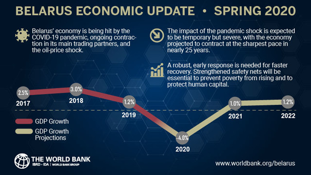 世界银行在今年春季发布的《白俄罗斯经济最新动态报告》显示,作为一个小型、开放的、依赖商品出口的经济体,白俄罗斯深受主要贸易伙伴经济衰退、油价暴跌以及疫情导致的全球金融动荡所造成的冲击。世行预计,白俄罗斯经济在2020年将至少收缩4%,为25年来的最大降幅,中期增长预计将保持疲软。
