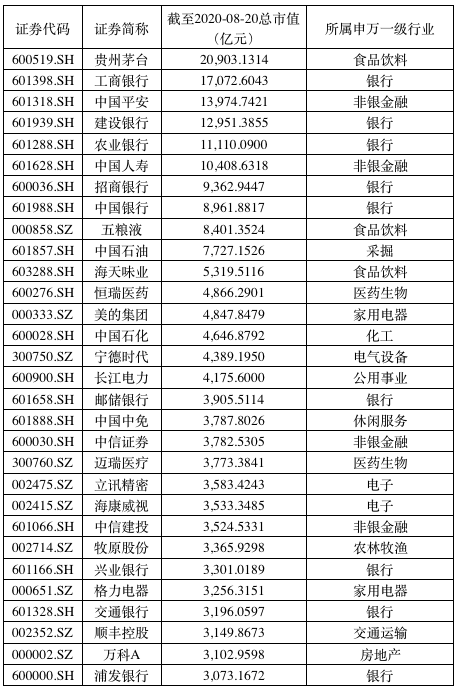 与此同时,在A股市值前30名中,消费里面的“三剑客”白酒、医药、食品饮料排名上升最快。食品饮料行业中五粮液(000858.SZ)、海天味业(603288.SH)也跻身A股市值前20阵营,位居前20的还有美的集团(000333.SZ)、恒瑞医药(600276.SH)、中国中免(601888.SH)、迈瑞医疗(300760.SZ);立讯精密(002475.SZ)、海康威视(002415.SZ)则排在前30名之内。
