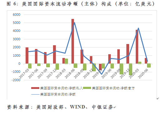 二是还有可能是官方净卖出美元资产,但私人部门净买入,总体依然为国际资本净流入。如据TIC统计,今年二季度,美国私人国际资本净流入726亿美元,官方资本净流出394亿美元,当期国际资本累计净流入332亿美元,为连续第五个季度净流入。