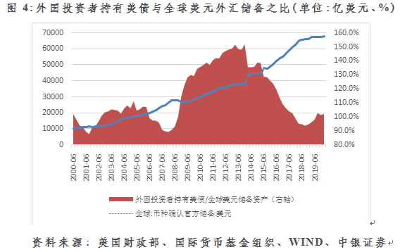 然而,把外国投资者美债持有直接等同于外国央行美债持有,是“以讹传讹”。一则,外国投资者持有,既包括外国政府(含央行)持有,也包括商业机构持有;二则,官方持有的美元外汇储备资产中,既包括债券资产,也包括股票资产,甚至个别更为激进的储备持有国还配置了另类资产。2000年二季度末至今年一季度末,外国投资者持有美债与全球美元外汇储备余额之比,最低时只有90%,最高时达到150%。