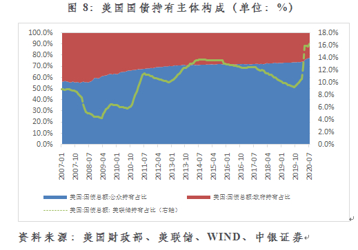 截至今年7月底,美国国债持有中,公众持有占比达77.8%,较2月底提高了3.4个百分点,占比已创历史新高;美联储持有占比达16.2%,较2月底提高了5.6个百分点,较上次危机应对时的高点上升了2.4个百分点。