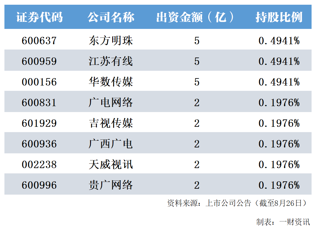 根据公告,东方明珠、华数传媒、江苏有线均拟出资5亿元,分别持股0.4941%。此外,广电网络、吉视传媒、广西广电、天威视讯、贵广网络等五家上市公司,均拟出资2亿元,分别持有0.1976%的股权。