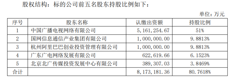 其中,广电股份为第一大大股东,持股51%;阿里巴巴创业投资管理有限公司持股9.8813%。前5大股东持股达80.7618%。