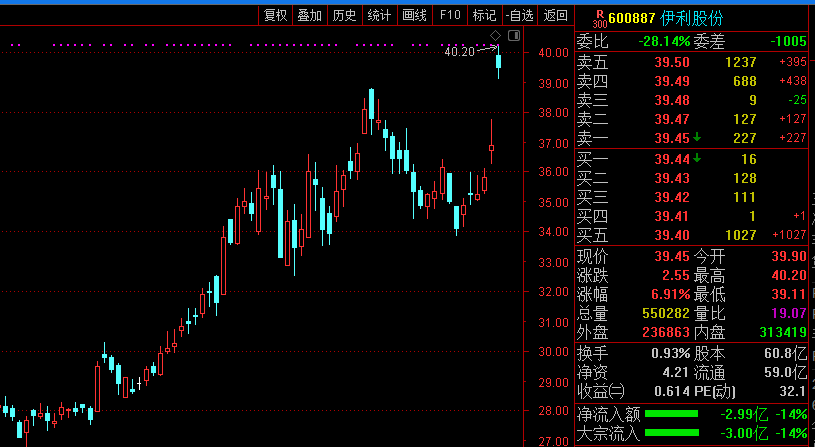 周五早盘,受强劲的二季度业绩数据刺激,奶业龙头伊利股份大幅高开8%。截至发稿,涨幅略有回落,报39.45元,涨6.91%,股价亦创出历史新高。