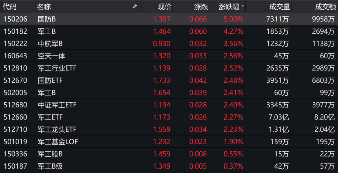 国防军工板块今日卷土重来,天海防务(300008.SZ)、新余国科(300722.SZ)、中国海防(600764.SH)等涨停,江龙船艇(300589.SZ)涨幅超过15%,申万国防军工板块涨幅为2.58%。消息面上,近期,航天科技集团与航天科工集团,在京签署深化战略合作协议。有分析人士认为世界级的航天军工集团即将诞生。场内国防军工主题基金悉数飘红,国防B(150206.SZ)涨幅为5%,军工B(150182.SZ)涨幅为4.27%。