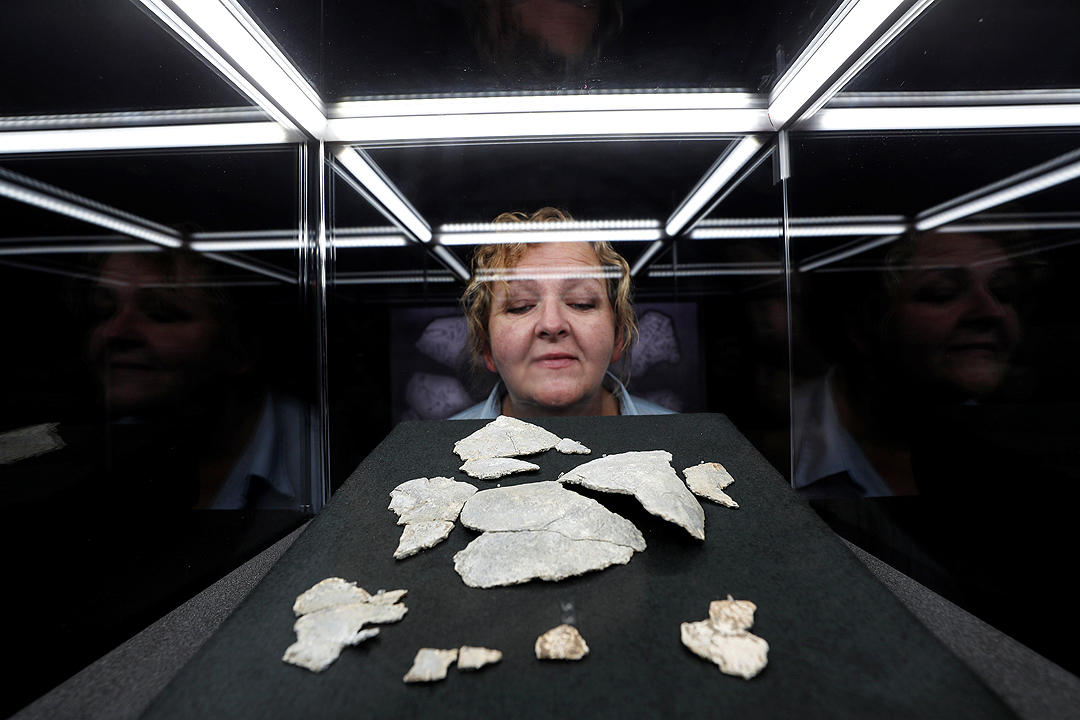 【当地时8月31日,英国诺森伯兰郡】文德兰达(Vindolanda)博物馆首次展出有1400年历史的基督教圣杯的碎片,据称这是英国有史以来最古老的人工制品。