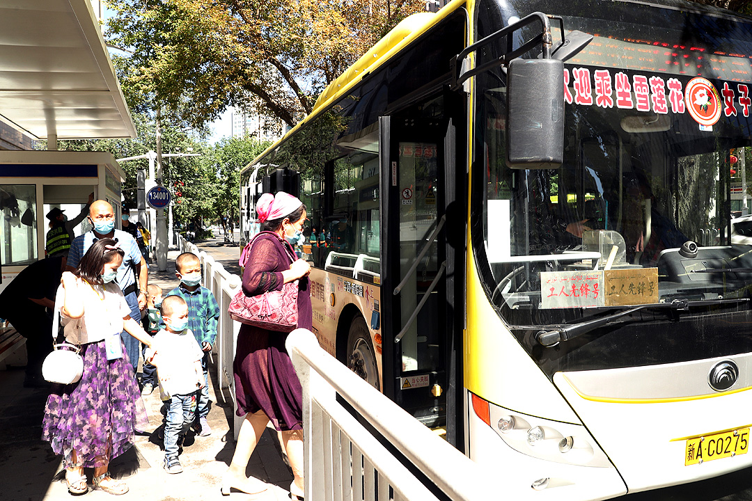 【2020年8月31日,新疆乌鲁木齐】小西门公交车站,乘客排队上车。9月1日晚,新疆维吾尔自治区党委召开视频会议宣布,在不放松常态化疫情防控措施的前提下,全疆全面恢复正常生产生活秩序。