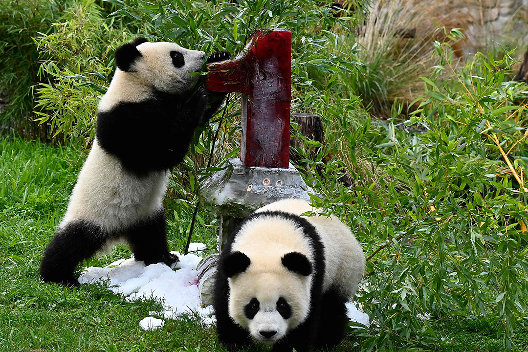 【当地时间8月31日,德国柏林】柏林动物园给旅德大熊猫双胞梦想(Pit)和梦圆(Paule)庆祝生日。