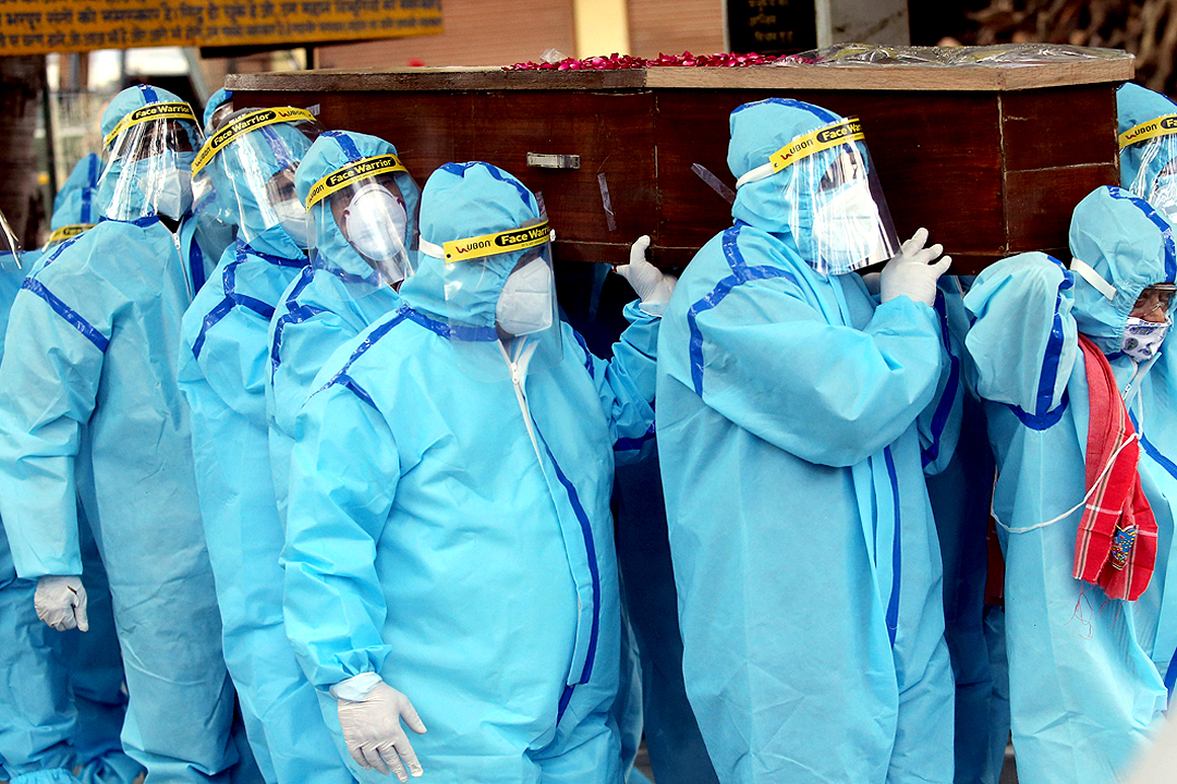 【当地时间9月1日,印度新德里】身着防护服的人们运送印度前总统普拉纳布·慕克吉的遗体。慕克吉感染新冠病毒,已入院治疗多日。8月31日在新德里去世,享年84岁。