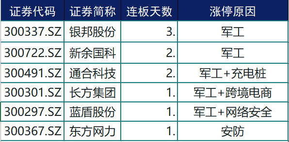 银邦股份(300337.SZ),新余国科(300722.SZ),通合科技(300491.SZ),长方集团(300301.SZ),蓝盾股份(300297.SZ)领涨,多只个股涨超5%。