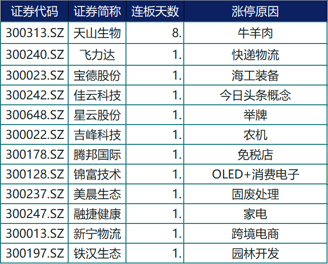 在天山生物的带领下,飞力达(300240.SZ),宝德股份(300023.SZ),佳云科技(300242.SZ)等多达十几只创业板股票涨停。