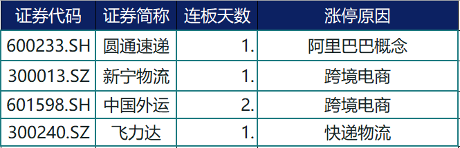 消息面,据新华社报道,9月1日起,在现有10个试点海关基础上,上海、福州、青岛等12个直属海关加入跨境电商B2B出口监管“试点群”。另外,在阿里增持的消息刺激下,港股圆通速递国际(06123.HK)今天最高涨幅达270%,带动A股相关个股走强。