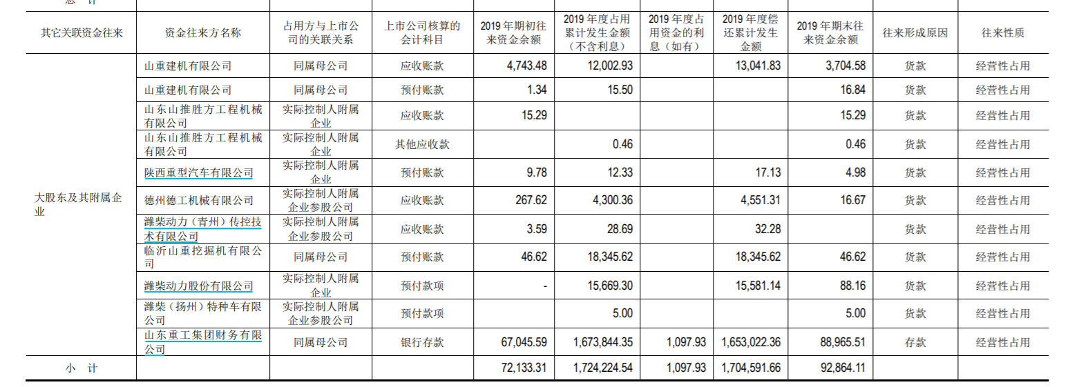 山推股份在重工财务公司的贷款余额11.9亿元,存款余额为11.5亿元,在后者的存贷款总余额中占比并不大,但后者占用山推股份资金的发生额,2019年却高达167亿元,累计还款额也高达165亿元。后者存在利用山推股份做资金生意,反复渔利的嫌疑。(如下图)