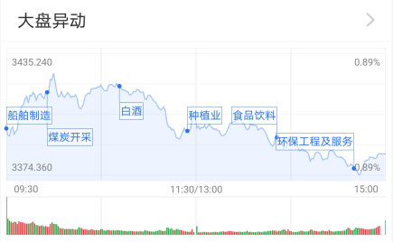 9月3日,两市总体冲高回落,开盘后指数延续震荡态势,临近午盘,大盘出现一波跳水,三大指数集体翻绿。午后,两市总体震荡下行,三大指数集体收跌,沪指跌破3400点,创业板指跌近1%。盘面上来看,白酒板块延续近期强势,周期板块煤炭、钢铁盘中也有所表现,农业、环保、物流等板块走弱。