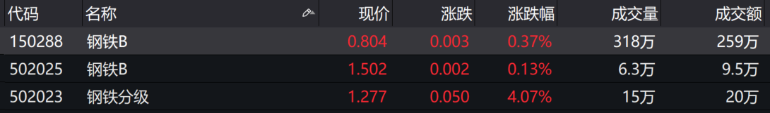 除此之外,周期板块今日同样有所表现,其中,申万钢铁行业涨幅为0.23%,在申万一级行业中位居第二,武进不锈(603878.SH)涨幅超过5%,太钢不锈(000825.SZ)、久立特材(002318.SZ)等个股跟涨。光大证券预计9月钢材市场供需格局边际改善,钢价走势偏强,焦炭价格偏弱、铁矿石价格偏强,钢材盈利有望改善,钢铁板块估值处历史低位,盈利改善有望带来板块估值修复。场内主题基金悉数收红,其中,钢铁分级(502023.SH)涨逾4%。