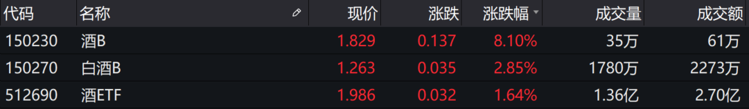 尽管A股震荡加大,但白酒板块仍然延续强势,金徽酒(603919.SH)涨停、洋河股份(002304.SZ)涨幅超过7%,口子窖(603589.SH)、伊力特(600197.SH)等个股跟涨。场内白酒主题基金悉数飘红,其中,酒B(150230.SZ)涨幅超过8%。