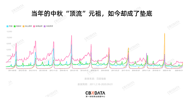 百度指数显示,月饼品牌们的搜索热度都会在中秋前后达到顶峰。2015年之前,元祖的确很风光。它和哈格达斯一起,凭借新奇的冰淇淋月饼,双双成为中秋“顶流”,堪称月饼界的喜茶。但近年来,元祖的声量却连年走低,在各大月饼品牌中垫了底。