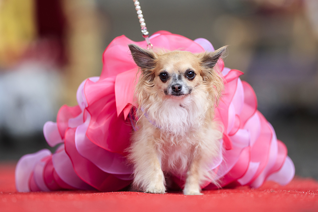 【当地时间9月6日,英国北约克郡】萌犬华丽亮相。当地举行以爱丽丝梦游仙境和查理与巧克力工厂为主题的宠物狗选美活动。
