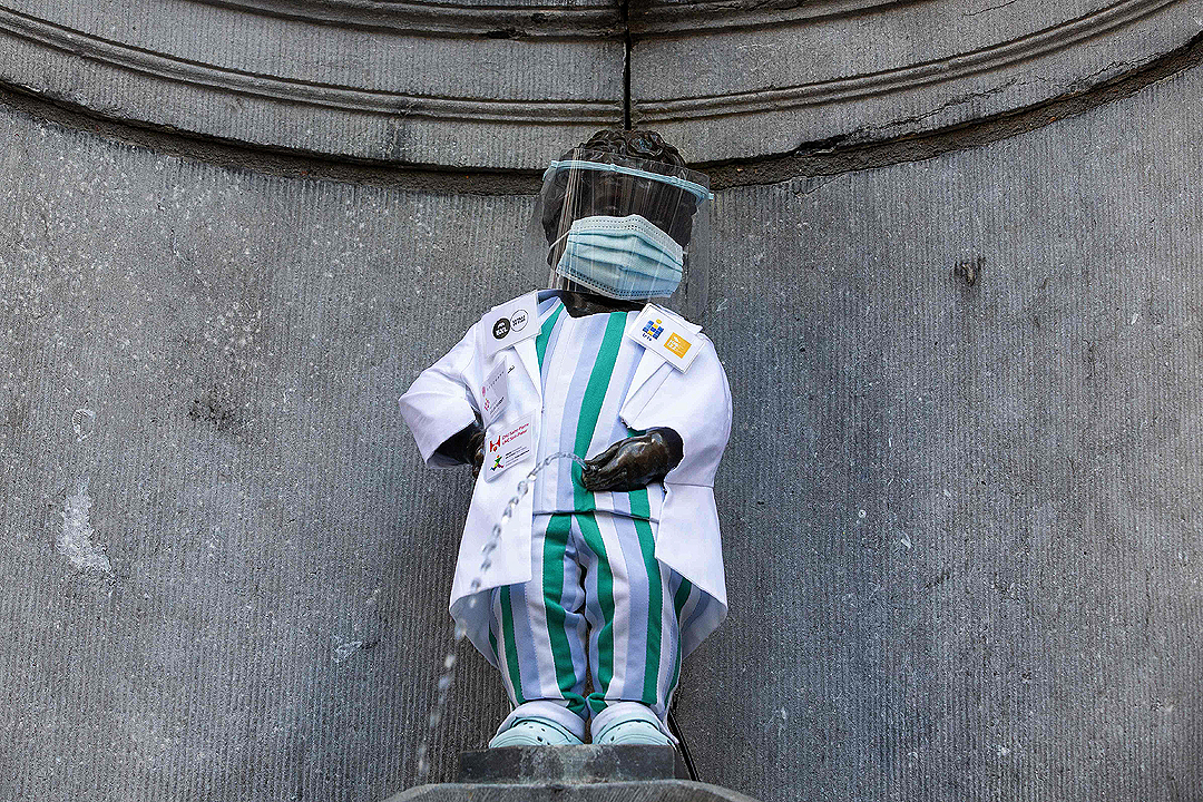 【当地时间9月5日,比利时布鲁塞尔】撒尿男孩被穿上衣服,旨在向向医护人员致敬。