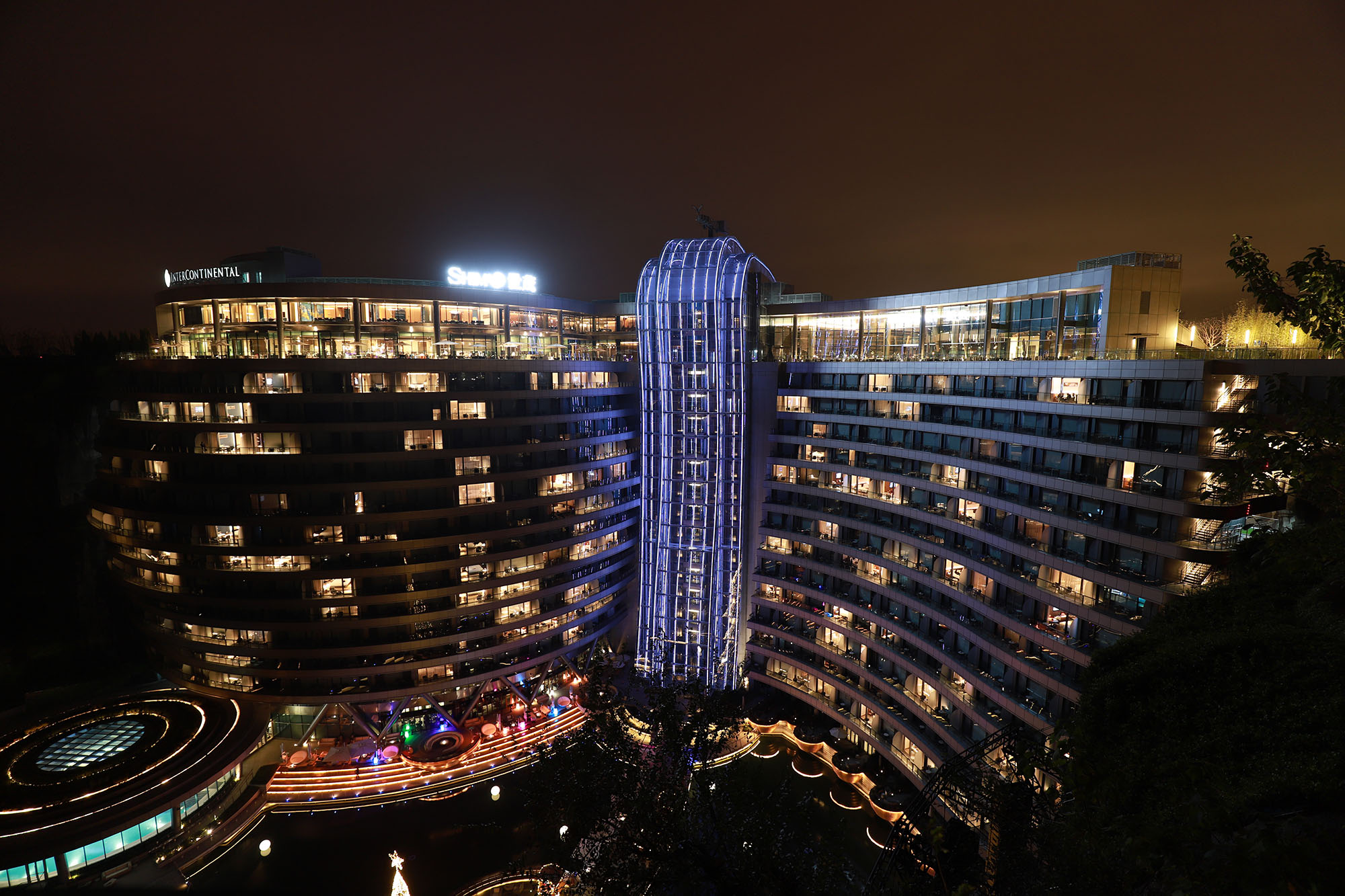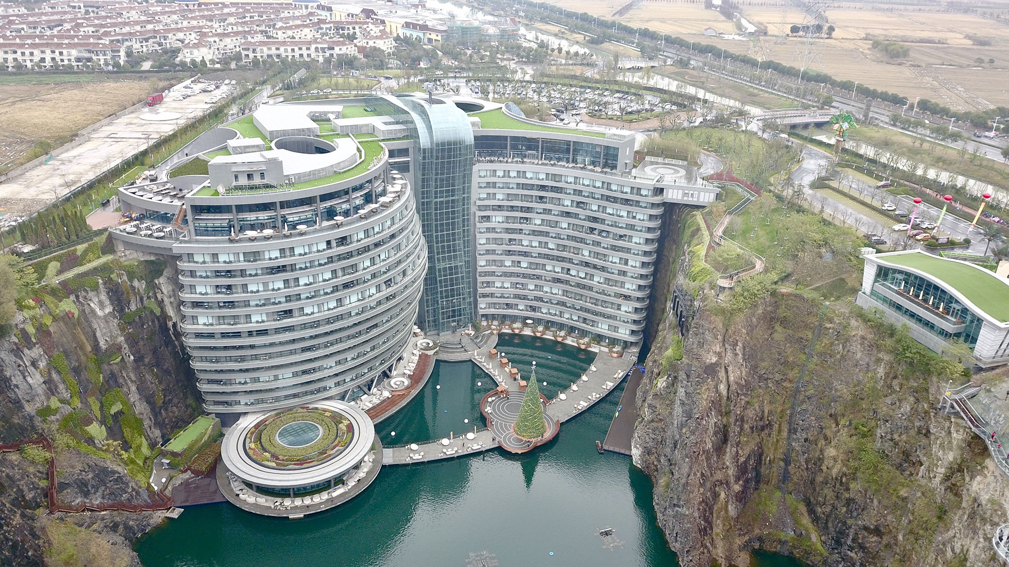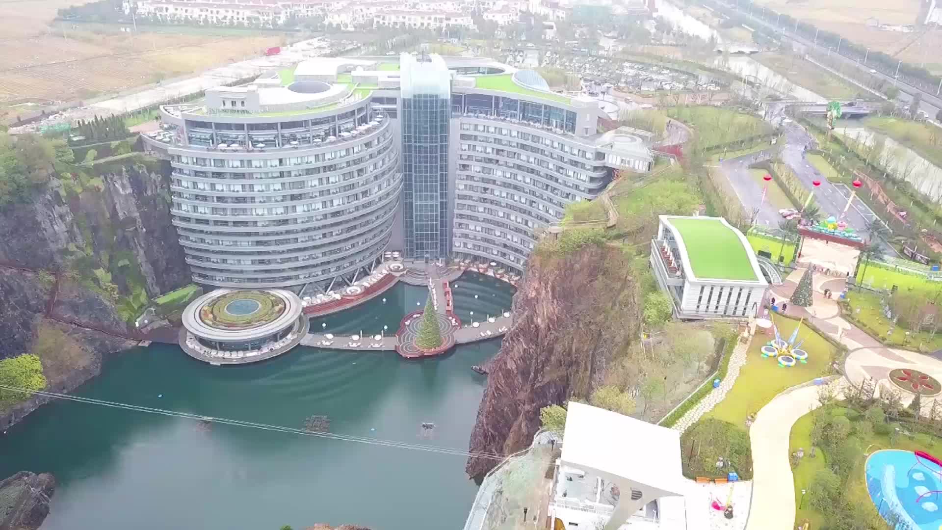 入选“世界十大建筑奇迹”的上海佘山世茂洲际酒店建于佘山脚下的一座负88米的深坑中,共建有336间客房。酒店约61087平方米的总建筑面积中,2层位于地面以上、15层位于地面以下,其中2层甚至位于水面以下。