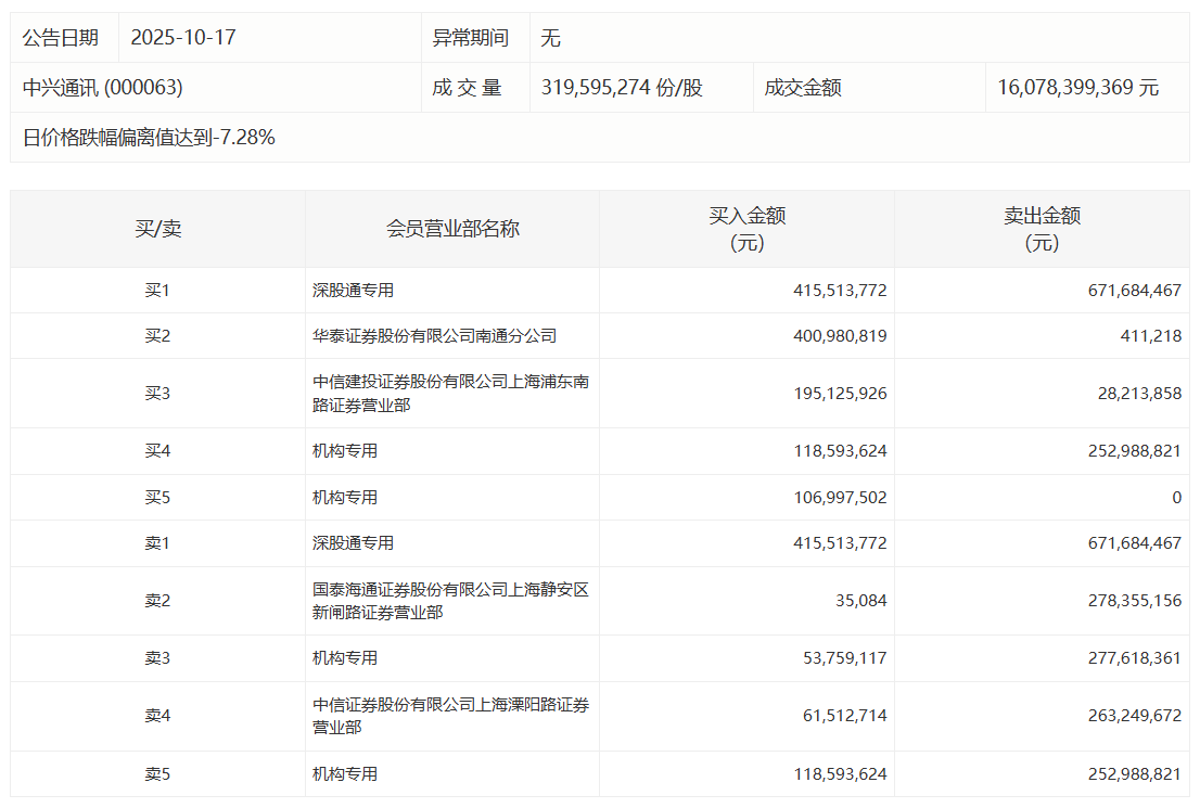 中兴通讯今日跌停,有2家机构专用席位净卖出3.58亿元