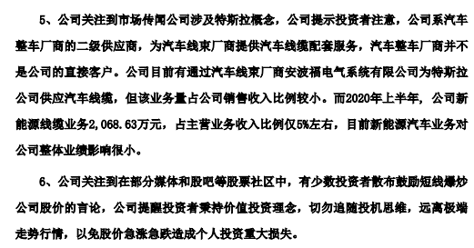卡倍亿表示,公司目前有通过汽车线束厂商安波福电气系统有限公司为特斯拉公司供应汽车线缆,但该业务量占公司销售收入比例较小。而2020年上半年,公司新能源线缆业务2068.63万元,占主营业务收入比例仅5%左右,目前新能源汽车业务对公司整体业绩影响很小。