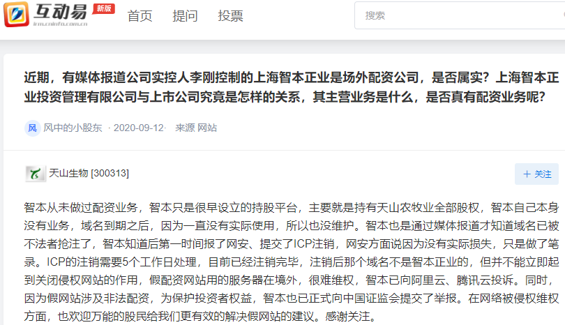 9月11日,天山生物发布澄清公告称,上海智本正业系公司控股股东天山农牧业发展有限公司的控股股东,一直从事农业投资管理,从未从事过股票配资业务。其网站域名已于2020年3月21日到期,到期后已无官网。根据域名信息查询结果,该域名已被注册人dropcatch.com重新注册,并沿用原ICP备案信息,假冒上海智本正业名义,盗用并篡改上海智本正业营业执照,利用并篡改其它公司网站展示的资质、许可证等照片,P图修改为“智本正业”,进行非法活动。