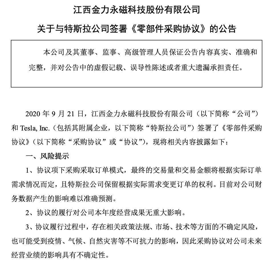 9月22日晚间,金力永磁发布公告称,公司于9月21日和Tesla,Inc.(包括其附属企业,以下简称“特斯拉公司”)签署了《零部件采购协议》。金力永磁表示,此次与特斯拉公司签署采购协议,为特斯拉公司提供稀土永磁产品,将对公司进一步拓展新能源汽车市场产生积极影响。
