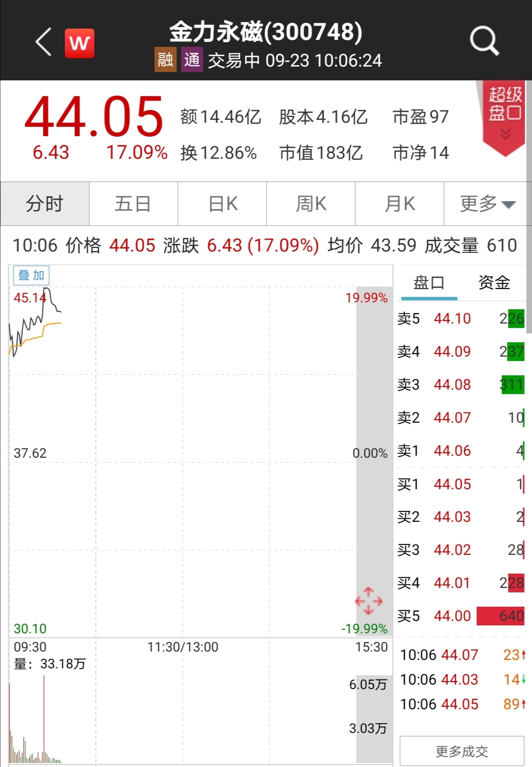 9月23日,金力永磁高开11%,随后股价持续走高,截至发稿,该股报44.05元/股,涨17.09%。