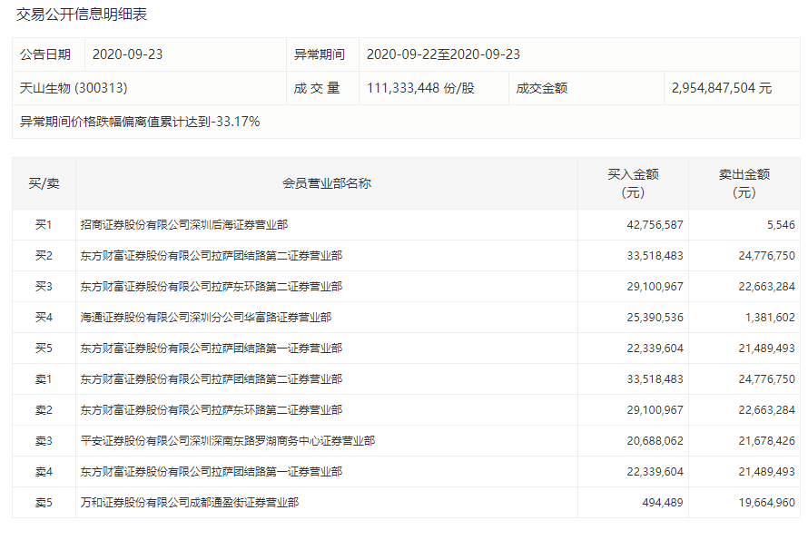 截至收盘,天山生物大跌超12%,盘后数据显示,招商证券股份有限公司深圳后海证券营业部买入4275万元,东方财富证券三营业部卖出近7000万元。