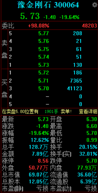 9月24日午后,豫金刚石持续走弱,一度触及跌停。截至发稿,豫金刚石跌19.64%,报5.73元/股,换手20%。另外,天山生物、长方集团跟随小幅跳水。