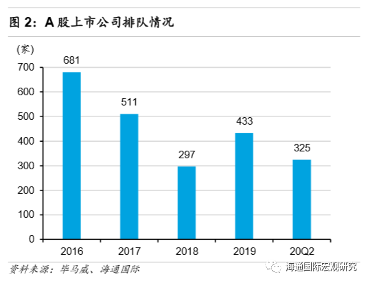 在核准制下,排队等候上市的公司往往多达数百家。自2000年启用核准制以来,证监会已6次暂停审核新股发行的申请(暂停时间累计加总达四年之久),以减轻A股市场当时的抛售压力。截至2016年底,排队等候上市审核的企业多达681家(图2),但当年仅审核了274家公司的申请。尽管此后审核速度有所加快,但截至2020年第二季度末仍有325家公司在排队等候发行审核。