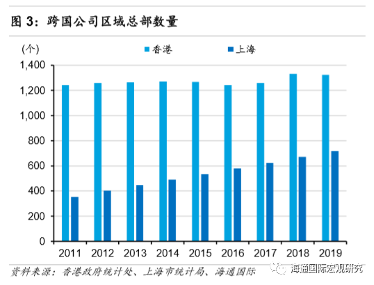 随着跨国公司得以更直接地参与中国金融市场,上海将从中受益,成为外资设立区域总部时的重要候选地。截至2020年3月,上海跨国公司区域总部数量达到720家,几乎是2011年(353家)的两倍(图3)。尽管该数量仍远低于设立在香港的跨国公司区域总部的数量(1325),但差距已在显著缩小。与香港相比,上海的优势在于低廉的劳动力成本、办公室租金和住房费用,也更容易直接打开内地巨大的市场。外资持股比例限制取消之后,估计部分跨国公司将考虑把地区总部从香港迁至上海。实际上,近期已有部分跨国公司宣布了类似的搬迁计划。