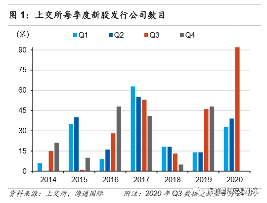 2019年6月,上海证券交易所(上交所)设立了独立于主板的科技创新板块(科创板)。与采用核准制的主板不同,科创板试点了注册制。新的发行上市制度放松了对上市企业的要求,简化了上市申请的流程,为企业提供了更方便快捷的上市途径。自新的上市制度启用以来,上交所新股发行数量增长迅速。截至9月24日,2020年第三季度新增上市公司达到92家,创下历史新高(图1)。