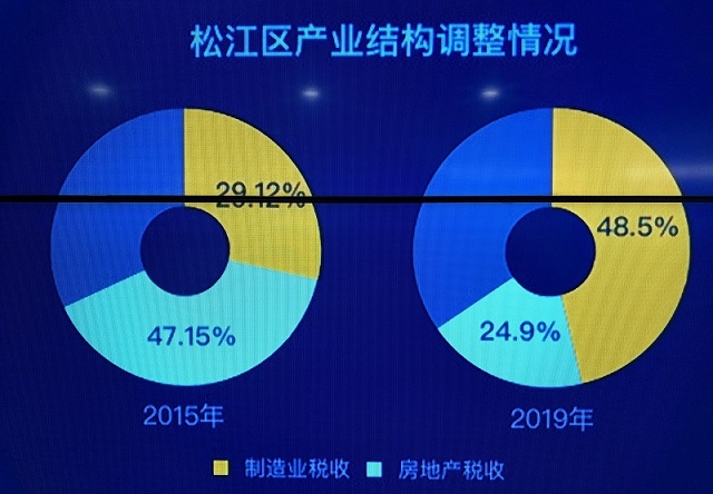 产业的优化也体现在税收结构上。统计显示,2015年,松江区房地产相关税收占比达47.15%,制造业仅29.12%;到2019年,房地产下降到24.9%,制造业提高到48.5%,结构明显优化。