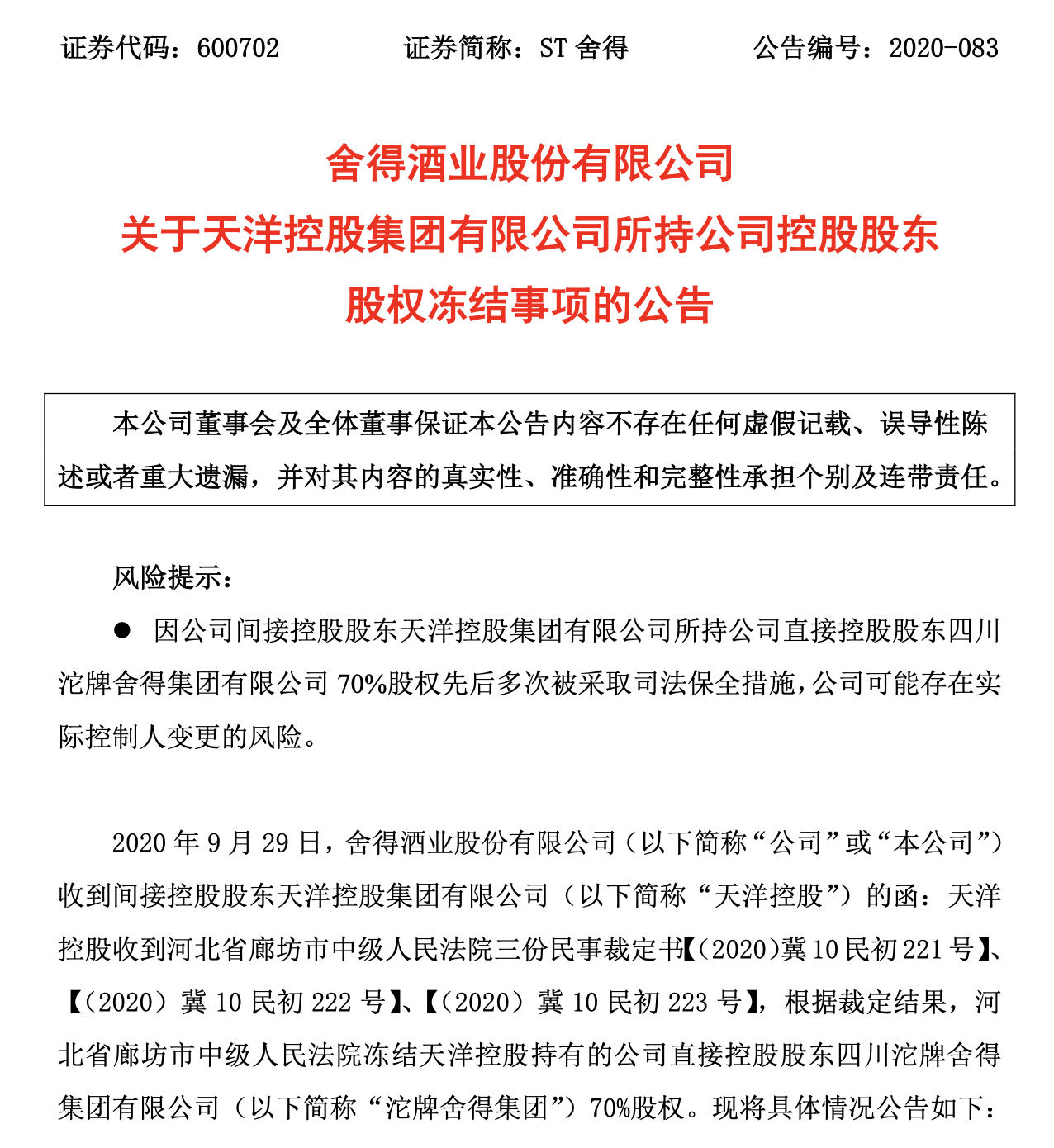 9月15日,中国建设银行股份有限公司廊坊分行因与天洋控股的债权债务事项,向河北省廊坊市中级人民法院申请对天洋控股采取诉前财产保全措施,河北省廊坊市中级人民法院经审查后,裁定对天洋控股持有沱牌舍得集团70%的股权予以冻结。