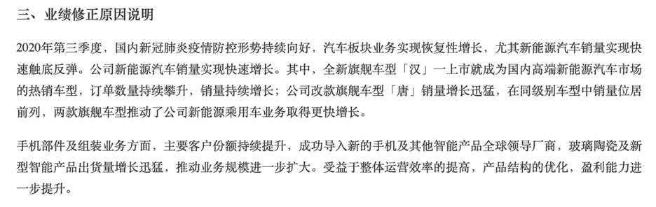 昨日晚间,比亚迪发布了前三季度业绩预告修正公告,大幅上修业绩预期。公告显示,公司预计修正后前三季度盈利为34亿~36亿元,同比增长115.97%~128.67%。此前比亚迪预告盈利为28亿~30亿元。