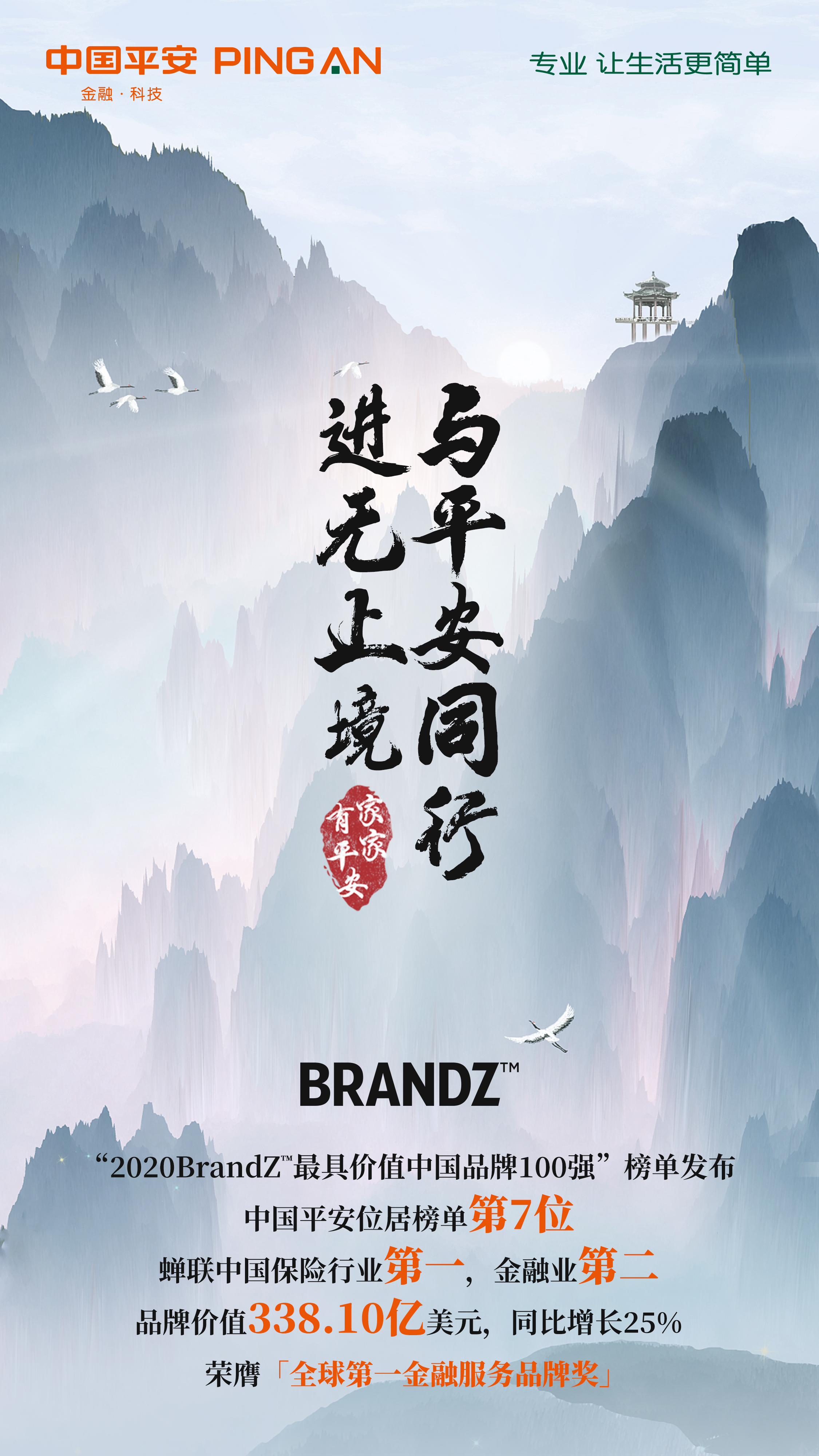10月15日,全球传播服务集团WPP携手凯度华通明略共同发布2020年“BrandZTM最具价值中国品牌100强排行榜”,中国平安位列榜单第7位,继续蝉联中国保险行业第一品牌,金融品牌第二名,品牌价值338.10亿美元,同比增长25%,增速引领中国金融业。此外,中国平安荣获全球第一金融服务品牌奖,平安集团旗下的陆金所连续两年上榜,排名提升7名至第19位,居消费金融行业第一位,品牌价值124.35亿美元,同比增长80%。