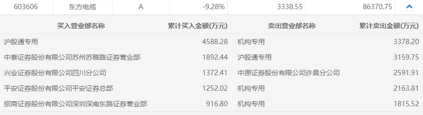 其中,人气概念股东方电缆跌停,截至收盘,报25.04元/股,全天换手率8.71%,成交额8.64亿元。此前,乘着政策利好“东风”,东方电缆股价曾连续创下收盘价新高。
