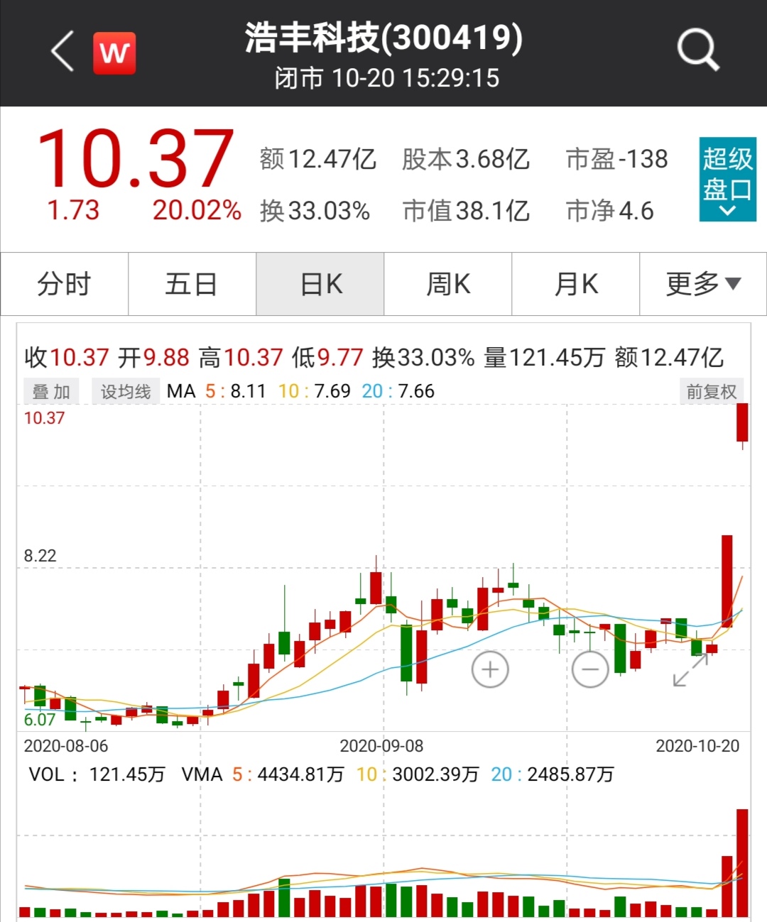 截至今日收盘,浩丰科技已连续两日涨停,报10.37元/股,股价较上周五收盘已涨44%。