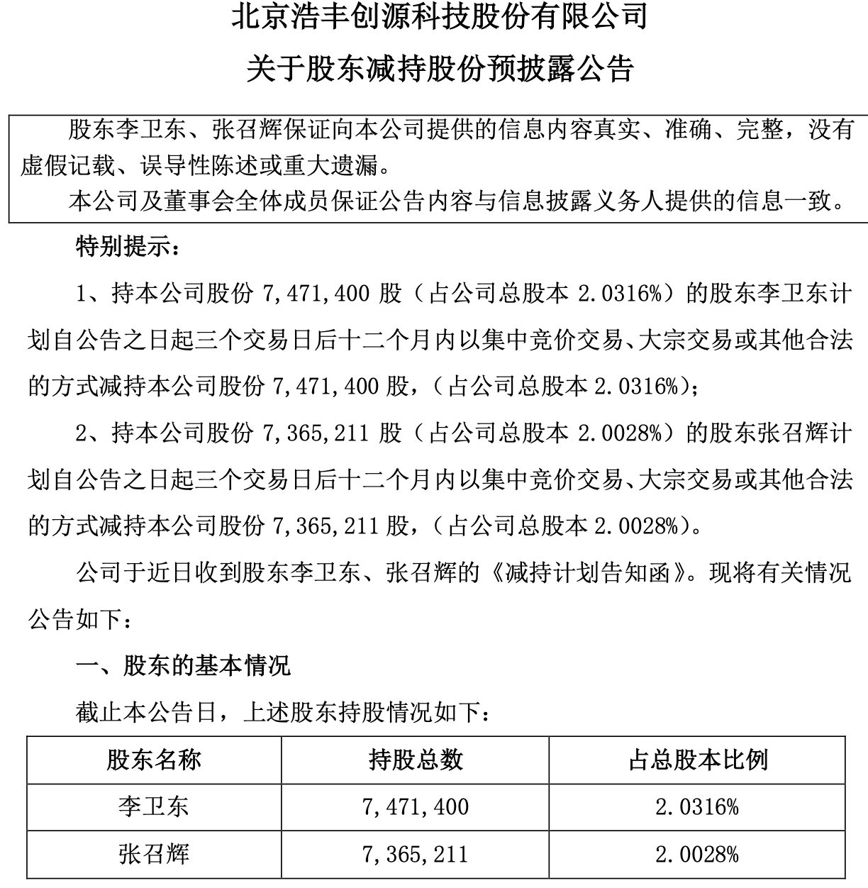 此外,浩丰科技今日还同时公告称,公司股东李卫东、张召辉拟各自“清仓式”减持公司约2%股份。根据公告,两位股东减持原因皆为自身资金需求。